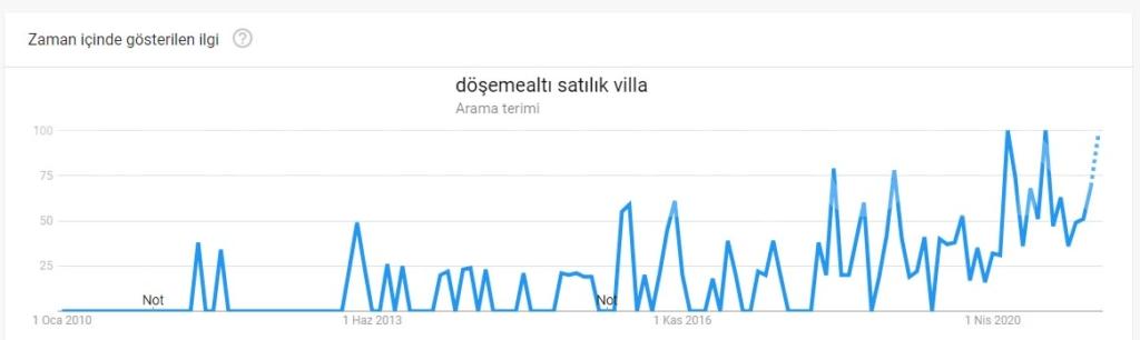 Döşemealtı’ndaki satılık villalara ilgi özellikle 2010 yılından sonra sürekli attı. Bu artış Google’da yapılan aramalarda da görülüyor. 2018, 2019 ve 2020 yıllarında talep sürekli arttı. 2021 yılında da talep yükselerek devam ediyor.